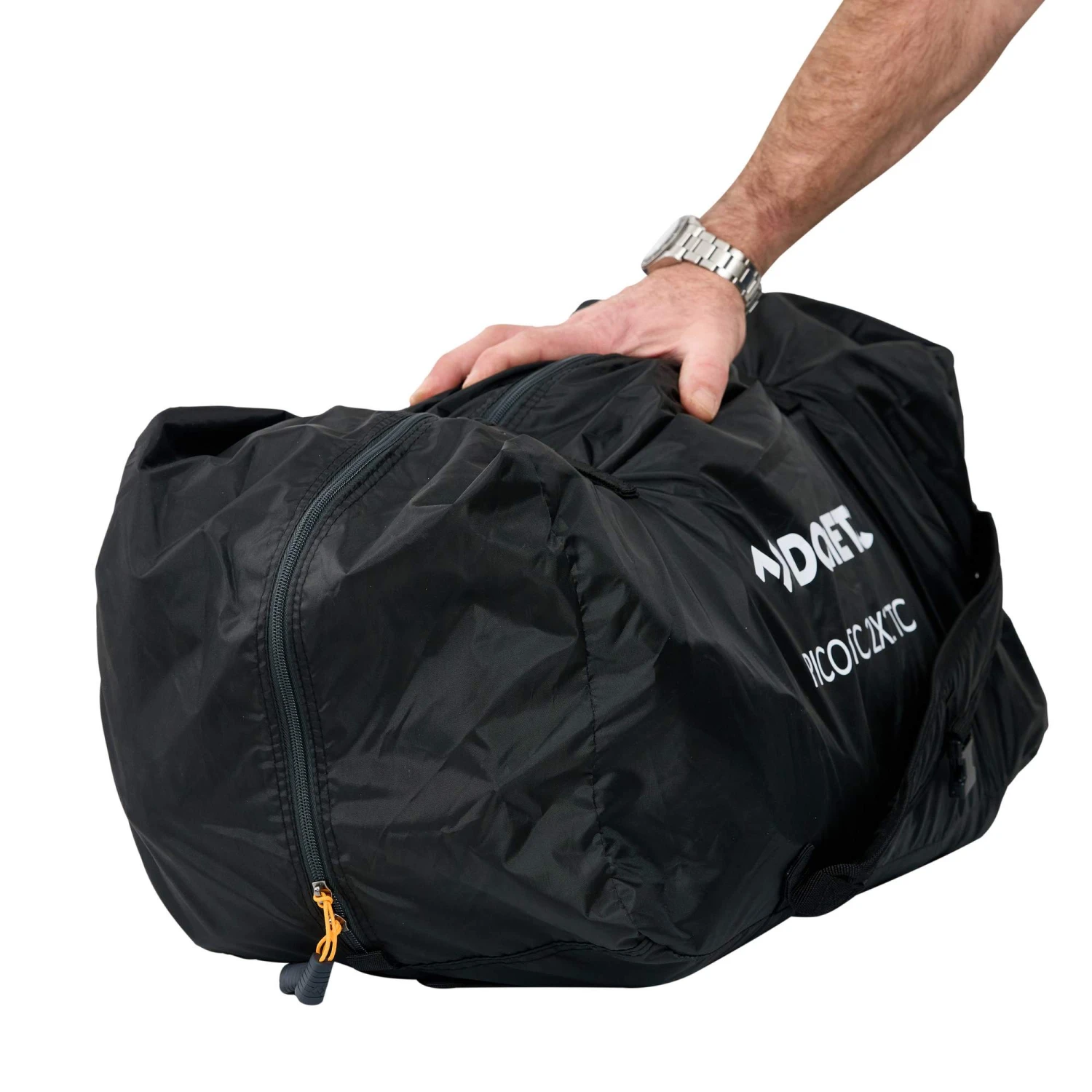 - Breiter, seitlicher Einstieg (mit den beiliegenden Tarpstangen als Vordach abspannbar)