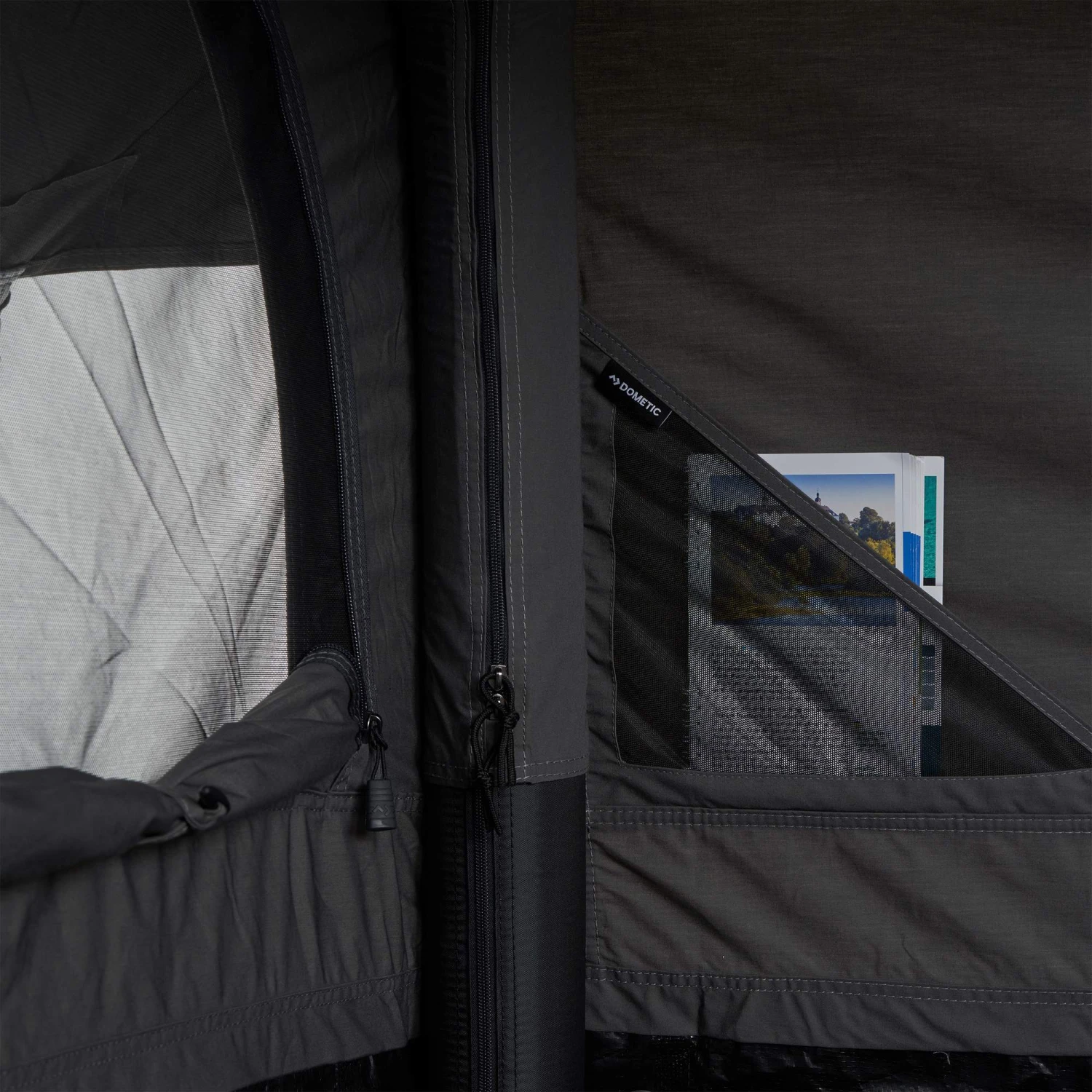 Im Kopf- und Fußbereich befinden sich große Lüftungsöffnungen mit Moskitonetz, die je nach Bedarf zum Teil oder vollständig geschlossen werden können. Im Inneren ist Platz genug für deinen Schlafsack und zum Verstauen deiner Kleidung. Zur weiteren Ausstattung gehört eine Netztasche für Kleinteile und eine Kabeldurchführung ins Innenzelt, die mit einem Reißverschluss verschlossen werden kann. Ein Karabiner erlaubt dir das Aufhängen einer Zeltlaterne unter der Decke.