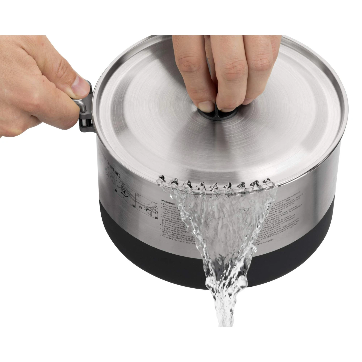 Der Edelstahldeckel besitzt einen Knauf aus Silikon, der auf der Deckelunterseite über einen kleinen Haken verfügt, der es dir ermöglicht, den Deckel während des Umrührens an den Topfrand zu stecken. Seitlich eingestanzte Löcher dienen als Sieb und lassen dich überschüssiges Nudelwasser abgießen.