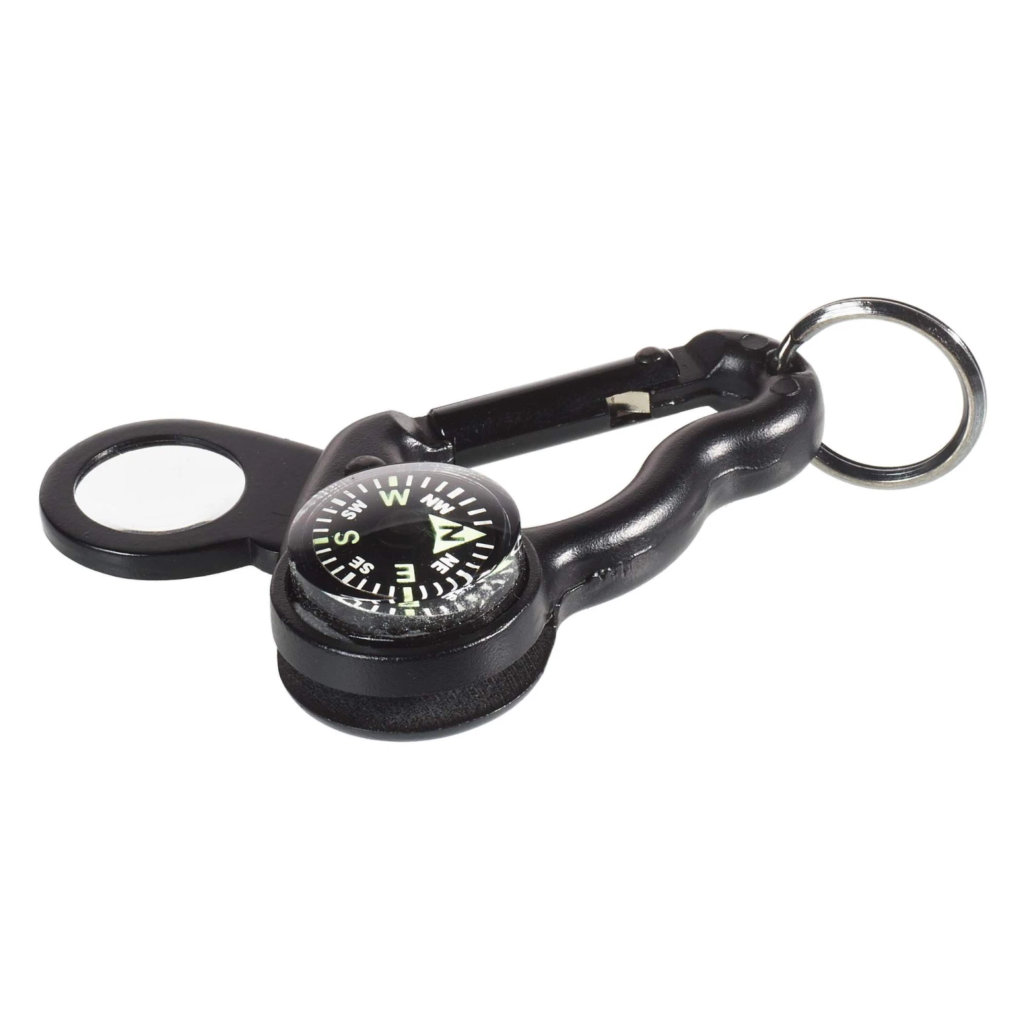Der Aluminium-Karabiner hat zusätzlich einen Schlüsselring: Dadurch lässt sich der MagniComp vielfältig befestigen. Der Schlüsselring ist aus Messing und beeinflusst den Kompass nicht. Für sicheres Ablesen im Dunkeln ist der Kompass fluoreszierend.